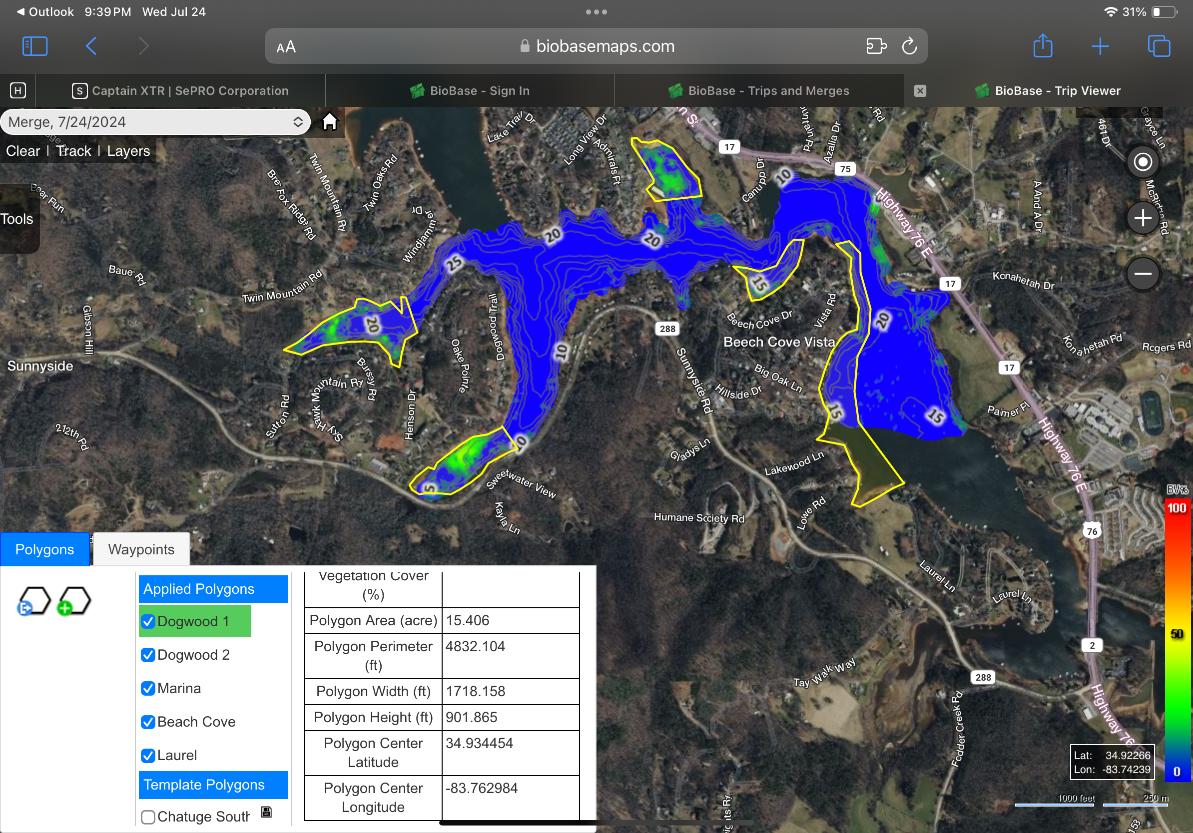 On 6/19/2024, Travis Hunt (Aqua Services Applicator) treated 51.2 acres total within Lake Chatuge where emerging parrots-feather was found (See Attached Maps). Plants were standing 5 feet tall (on average) in an average water depth of 10 feet. Due to the increased depth and water volume, a higher rate of Procellacor SC was applied.